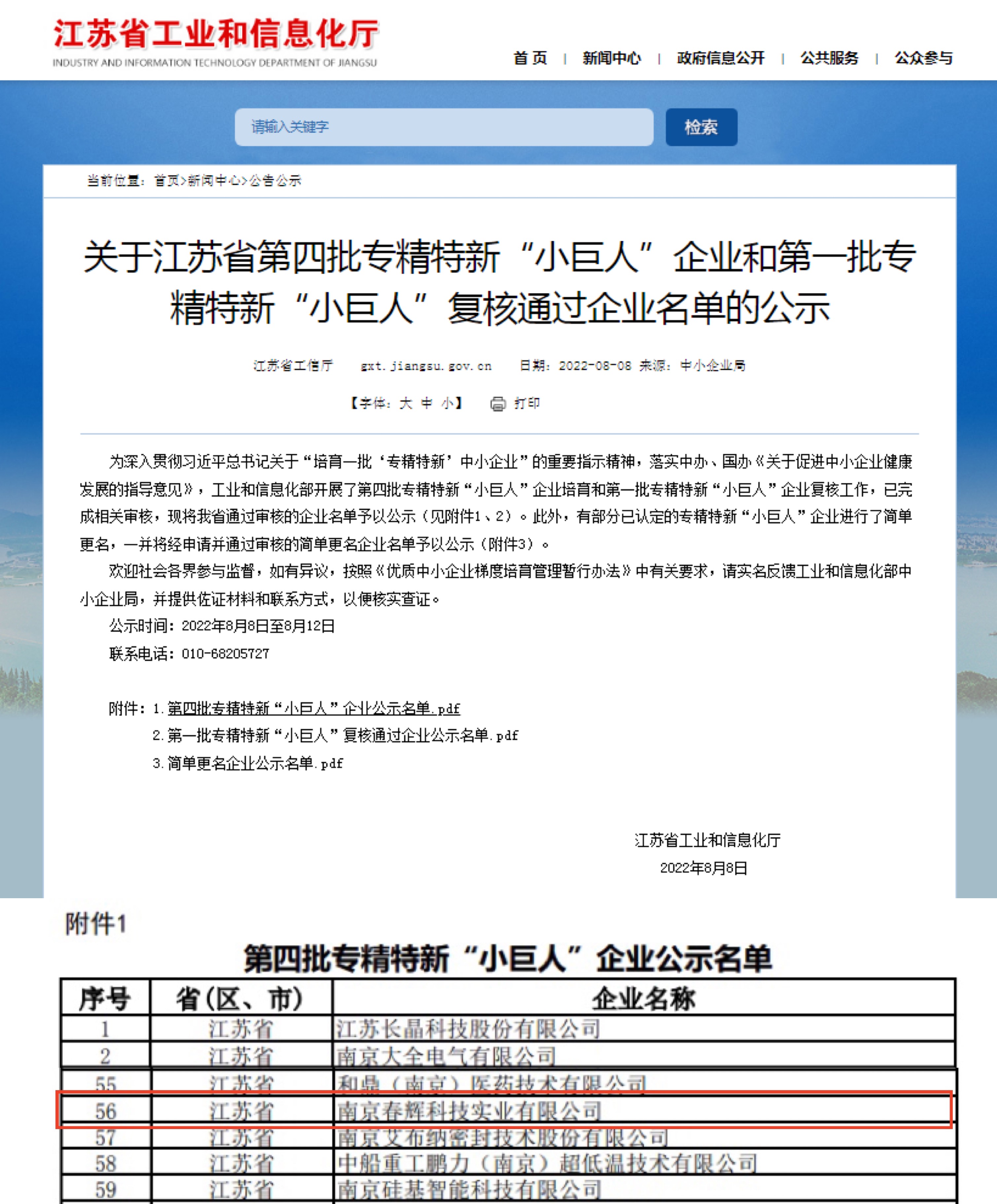 為深入貫徹習(xí)近平總書記關(guān)于“培育一批‘專精特新’中小企業(yè)”的重要指示精神,落實(shí)中辦、國辦《關(guān)于促進(jìn)中小企業(yè)健康發(fā)展的指導(dǎo)意見》,工業(yè)和信息化部開展了第四批專精特新“小巨人”企業(yè)培育工作。2022年8月8日,江蘇省工業(yè)和信息化廳公示了全國第四批專精特新“小巨人”企業(yè)名單,南京春輝科技實(shí)業(yè)有限公司脫穎而出,被認(rèn)定為國家級專精特新“小巨人”企業(yè)。