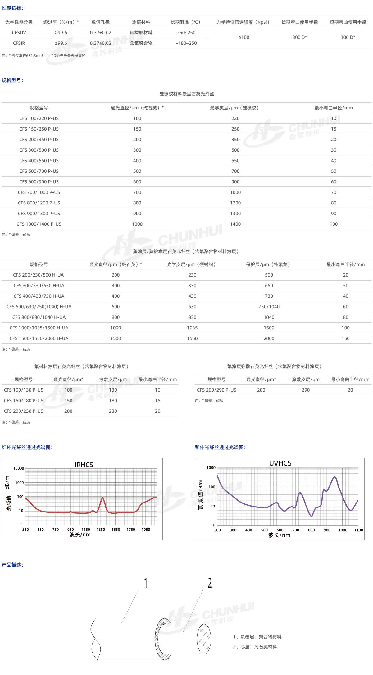 采用高折射率純石英玻璃材料作為芯層,低折射率聚合物作為光學(xué)皮層;