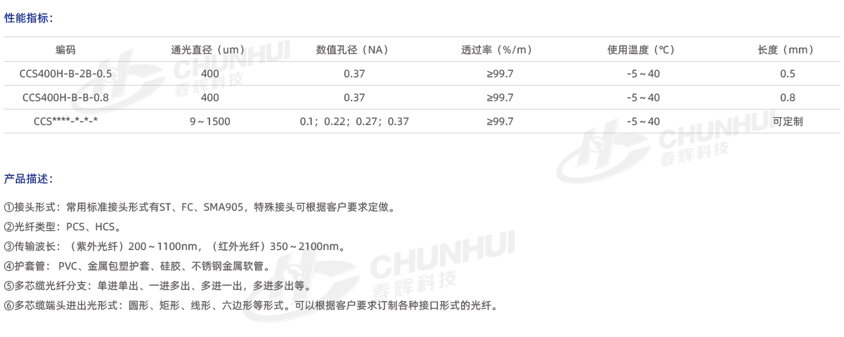 由石英光纖絲、護(hù)套管、光纖連接頭組成,主要分為單芯纜、多芯纜